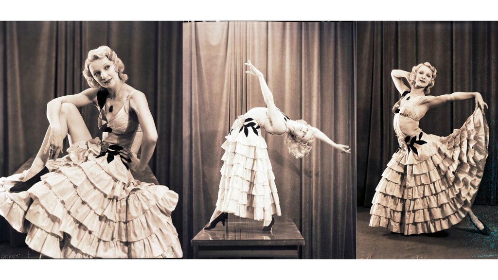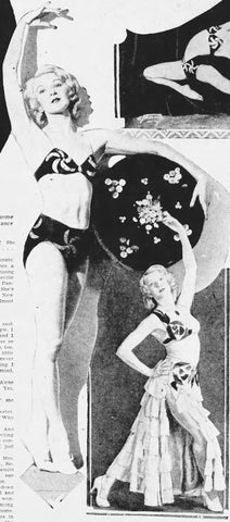 She performed an “apache dance” that featured stunts, throws, and tosses. In another interview, Alene stated, ‘I’ve been knocked out, had ribs broken and undergone all kinds of bruises while dancing, but that’s just part of the game. I realize the four spins I take while jumping from the pedestal to my partner make the trick somewhat dangerous, but I try not to miss. When the weather is warm and the hands perspire, sometimes we get a pretty loose hold, but that’s a chance we take.” (“Alene Hoover Braves Stage Dance Danger.” Omaha Sunday Bee News. Page 8. May 29, 1932)