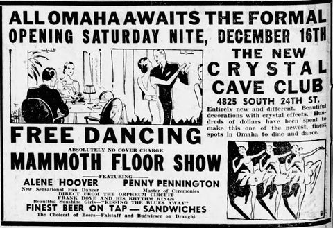 - Omaha World Herald. Ad for Crystal Cave Club. Alene Hoover Fan Dance. Page 12. December 15, 1933