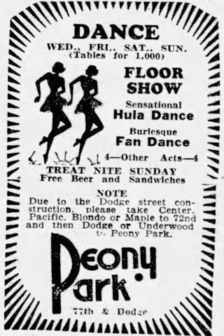 - Omaha World Herald. “Treat Nights Will Continue at Peony.” Page 39. February 4, 1934