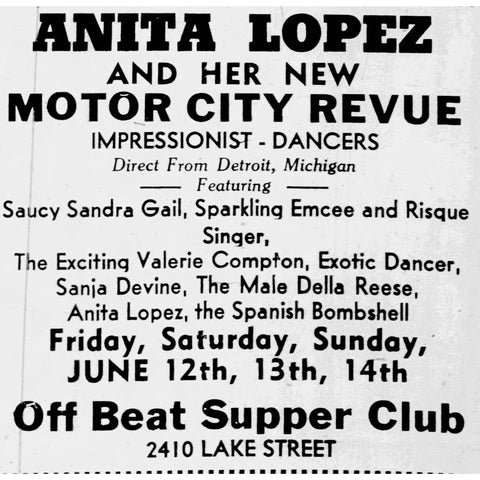 From June 12-14th, 1964, Anita Lopez and her Motor City Revue were featured at the Off Beat Supper Club. Her dancers were called “impressionist dancers,” hailing from Detroit, MI. The other performers on the bill were, Sandra Gail, a risqué singer and emcee, Valerie Compton, an exotic dancer, Santa Devine, the “Male Della Reese”, and Anita Lopez, the “Spanish Bombshell.”