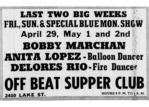 On April 29 and May 1-2, 1960, Anita Lopez, nationally famed dancer, appeared at the Off Beat Supper Club along with Delores Rio “fire dancer.”