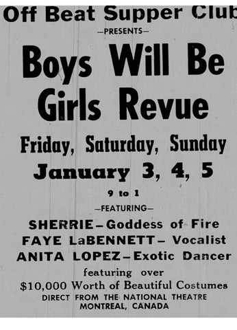 On January 3-5, 1964 the Off Beat presented “Boys Will Be Girls Revue”, featuring Sherrie, “Goddess of Fire”, Faye LaBennett, vocalist, and Anita Lopez, exotic dancer. The show boasted $10,000 worth of costumes were featured from the National Theatre in Montreal, Canada.