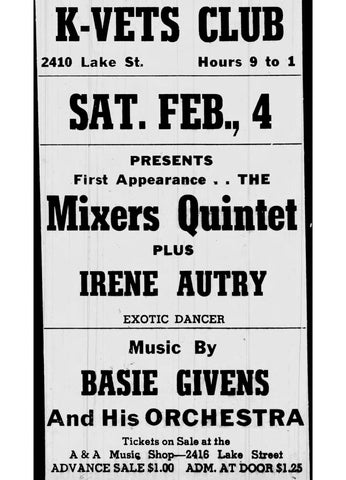 On Saturday February 4th, the K-VETS brought the Mixers Quintet plus an exotic dancer by the name of Irene Autry, with music by Basie Givens’ Orchestra.
