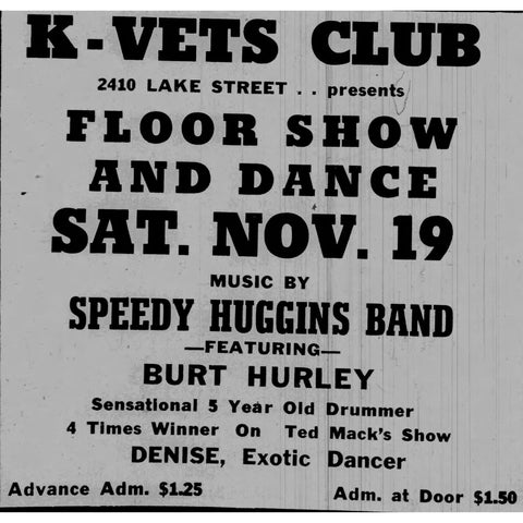 Then on Saturday November 19th, the K-VETS produced a floor show and dance featuring “Denise”, an exotic dancer, along with a drummer Burt Hurley and Speedy Huggins Band.