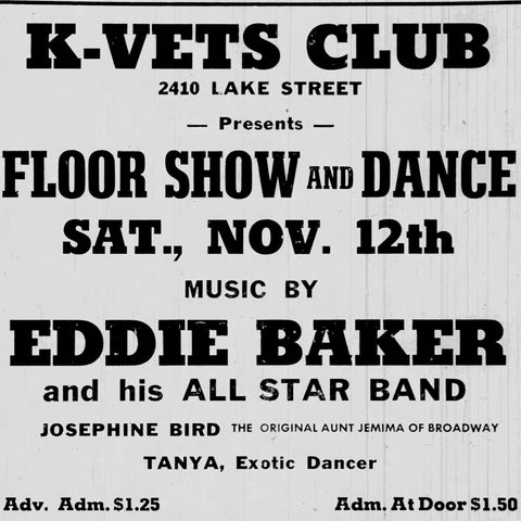 On November 12th, the K-VETS produced a floor show with music by Eddie Baker and performances by Josephine Bird and Tanya. Bird was billed as “The Original Aunt Jemima of Broadway” and Tanya as “Exotic Dancer.”