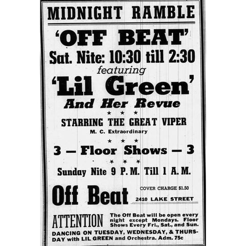 The Off Beat was open every night except Mondays. They hosted floor shows every Friday, Saturday, and Sunday. Dancing for patrons was on Tuesday, Wednesday, and Thursdays with ‘Lil Green’ and Orchestra. Admittance was 75 cents to dance on those days.