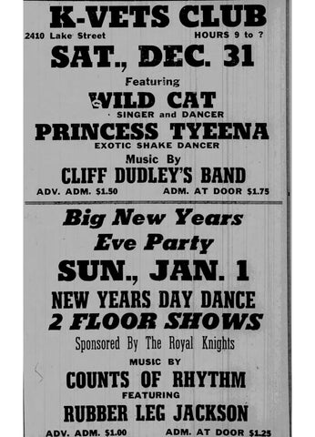 On Saturday April 21, the K-VETS brought an exotic dancer named Clarice Ford to perform along with “The Mighty Spoon; Mr. Blues Himself” and Big George’s Orchestra. There was a special admission price between 9:00pm and 9:30pm of $1. General admission outside of the time frame was $1.25. ‘Mr. Blues’ was Wynonie Harris.