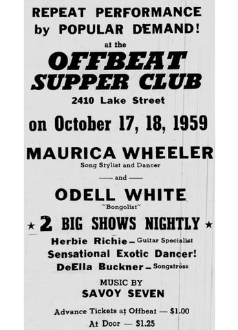 On October 17-18, 1959, the Offbeat hosted Maurica Wheeler, singer and dancer, with “bongo list”, Odell White. A “sensational exotic dancer” is advertised but no name is listed. See Tarza dance her “Burlesque in Harlem” here.