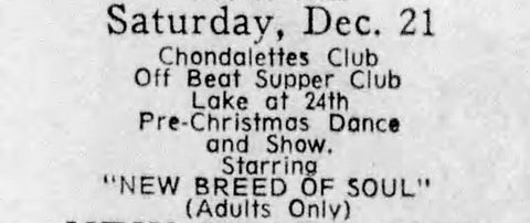 Finally, on December 21, the Chondalettes Club rented the Off Beat Supper Club for a “Pre-Christmas Dance and Show” starring “New Breed of Soul”, advertised as “Adults Only.” Suspicious- no exotics or go-go dancers are mentioned in the advertisement.