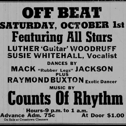 On Saturday October 1st, Raymond Buxton, an exotic dancer, was billed with Luther ‘Guitar’ Woodruff and Susie Whitehall (singer) at the Off Beat Club.