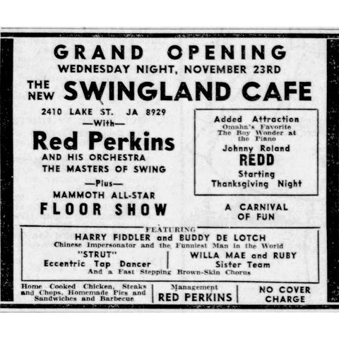 - Morning World Herald. Ad for Swingland Cafe. November 20, 1938
