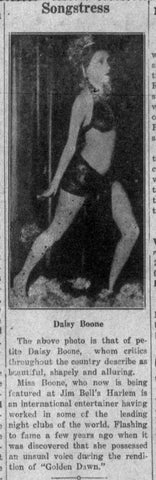 In 1937, Jim Bell’s Harlem hosted the ‘danseuse’ and songstress Daisy Boone. Miss Boone was an internationally known dancer with an unusual voice.