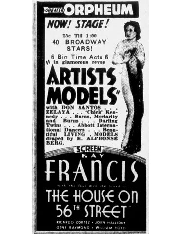 - “Artists Models” on stage and “The House on 56th Street” on screen. (Omaha Morning Bee News. Orpheum Advertisement. January 8, 1934)