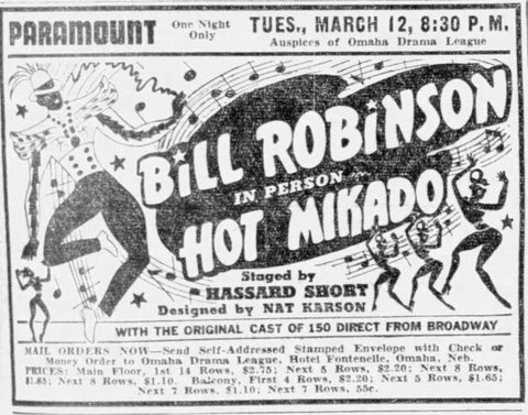After their second season at the New York World’s Fair, the production went on tour and appeared for one night only. It opened at the Paramount on March 12, 1940 to almost 3,000 people. The show was sponsored by the Omaha Drama League. The Omaha papers list Rose Brown, who played Katisha, as being influenced by Mae West, and Bill Robinson as a man with energy of someone half his age.