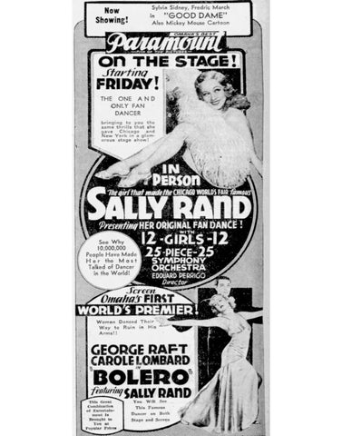 The article reads, “The girl who made the World Fair famous, the girl whom 10,000,000 people made the most talked about dancer in the world. None other than SALLY RAND, the one and only inimitable fan dancer. The Paramount theatre in Omaha has made arrangements to present Miss Rand in her only personal appearance in this territory. She will appear in person in a gigantic and glamorous stage show for one week starting Friday, Feb. 23, at the Paramount. On the same show the Paramount will present a 25 piece symphony orchestra, 12 beautiful girls, and other entertainment. “Bolero” is the motion picture that stars George Raft, Carole Lombard, and also features Sally Rand in her first talking picture. In the picture Miss Rand also does her famous fan dance, so you will have an opportunity to see Sally on both stage and screen. “Bolero” incoporates the famous Bolero dance which is said to be one of the most eye-filling dances every performed except the Fan Dance.”