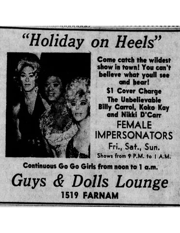 Bars and lounges during the 1960s and 70s featured continuous entertainment, whether that be a band, a singer, a burlesque dancer, or a drag queen. The Guys & Dolls Lounge was no exception. It was located at 1519 Farnam Street and frequently hosted Go-Go contests and burlesque dancers. In the above advertisement, patrons would’ve seen Billy Carrol, Koko Kay, and Nikki D’Carr from 9PM to 1AM with continuous go-go girls from noon to 1am!