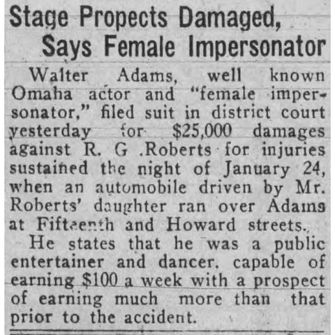 One of the earliest instances of drag I found in the newspapers was of Walter Adams who filed a lawsuit in district court after a traffic accident that left him with injuries, unable to perform. The article states he was able to earn at least $100 a week as a drag queen in Omaha in 1920. $100 in 1920 is worth a little more than $1,600 today.