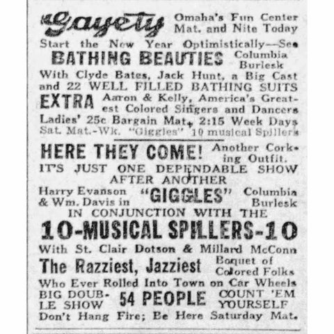 - “Columbia Burlesk: Bathing Beauties with Clyde Bates, Jack Hunt, and a Big Cast of 22 Well Filled Bathing Suits. Aaron & Kelly- America’s Greatest Colored Singers and Dancers. Harry Evanston in “Giggles” in conjunction with the 10 musical spillers with St. Clair Dotson and Millard McConn. The Razziest, Jazziest Bouquet of Colored Folks who ever rolled into town on car wheels. BIG DOUBLE SHOW – 54 people – Count ’em Yourself. Don’t Hang Fire; Be Here Saturday Mat.” (Evening World Herald, January 1924)