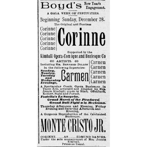 In December 1890, the Boyd Theater hosted Kimball Opera-Comique and Burlesque Co. which featured a soubrette named Corrine. The company performed two productions: ‘Carmen’ and ‘Monte Cristo Jr.’–though the daily newspaper noted the scores bared no resemblance to the originals. The company was managed solely by Mrs. Jennie Kimball and was composed of 60 artists, including Bernard Dillon. Three acts composed Carmen; “Fostella’s La Surprise,’ ‘Grand March of the Picadores,’ and ‘Grand Bull Fight a la Mexicana.’ Corinne played Edmund Dantes in Monte Cristo Jr. (Omaha Daily Bee. Article and Advertisement for Boyd Theater. December 28, 1890)