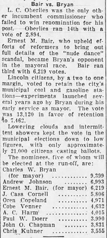 (Omaha World Herald. “Bryan Leads Lincoln Field; Mayor Fleming Fails to Gain Nomination; Oberlies Defeated.” Lincoln, NE. Page 3. April 10. 1935)