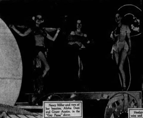(Lincoln Nebraska State Journal. “State Fair Attendants.” Page 69. August 29, 1937. Photo Caption: “Nancy Miller and two of her beauties, Aloha Dean and Ginger Austin, in the ‘Gay Paree’ show.”)
