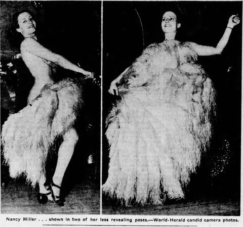 In 1937, Miss Miller, at age 23, performed one large white ostrich feather fan at the Nebraska State Fair. Her act at the “Gay Paree” show on the Midway caused quite the kerfuffle. Her costume was merely listed as ‘shoes’ and a single feather fan in the Omaha World Herald.