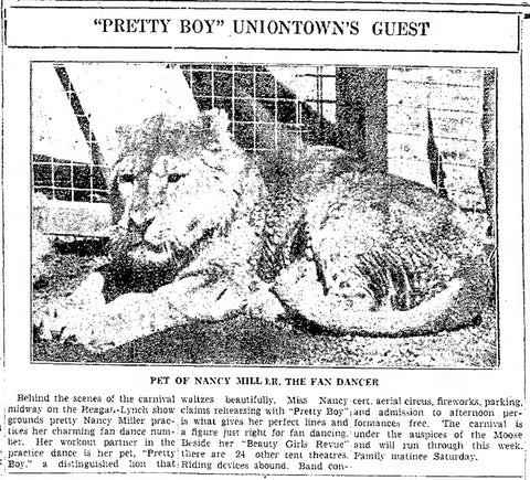 In September 1935, Miller continued to travel with Dodson’s Circus to Uniontown, PA. The Evening Standard News reported on Nancy Miller and her “pet”, a lion owned by the circus by the name of “Pretty Boy.”