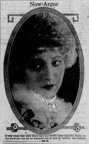 [Caption reads: “If you think that Sally Rand isn’t one of the most beautiful women in the world you can get an argument out of Cecil B. DeMille, who declares she is.”]