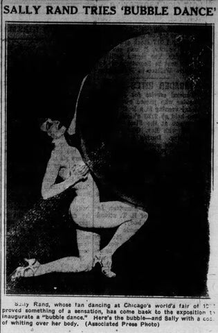 The caption reads, “Sally Rand, whose fan dancing at Chicago’s World’s Fair of 1933 proved something of a sensation, has come back to the exposition to inaugurate a ‘bubble dance.’ Here’s the bubble–and Sally with a coat of whiting over her body.” Rand typically painted her body with white talc powder before performing.