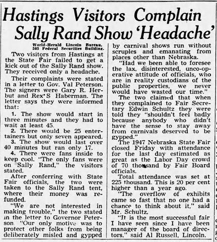 (Omaha World Herald. “Hastings Visitors Complain Sally Rand Show ‘Headache’.” Page 1. September 6, 1947)
