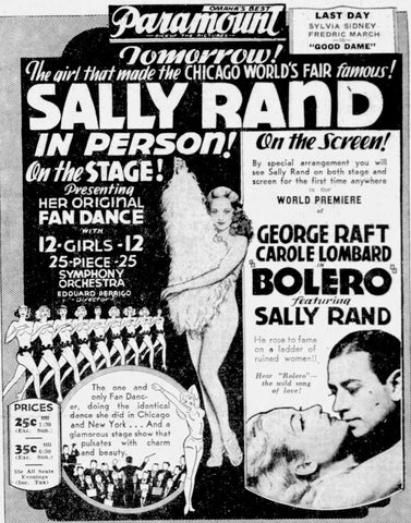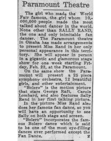 The article reads, “The girl who made the World Fair famous, the girl whom 10,000,000 people made the most talked about dancer in the world. None other than SALLY RAND, the one and only inimitable fan dancer. The Paramount theatre in Omaha has made arrangements to present Miss Rand in her only personal appearance in this territory. She will appear in person in a gigantic and glamorous stage show for one week starting Friday, Feb. 23, at the Paramount. On the same show the Paramount will present a 25 piece symphony orchestra, 12 beautiful girls, and other entertainment. “Bolero” is the motion picture that stars George Raft, Carole Lombard, and also features Sally Rand in her first talking picture. In the picture Miss Rand also does her famous fan dance, so you will have an opportunity to see Sally on both stage and screen. “Bolero” incoporates the famous Bolero dance which is said to be one of the most eye-filling dances every performed except the Fan Dance.”