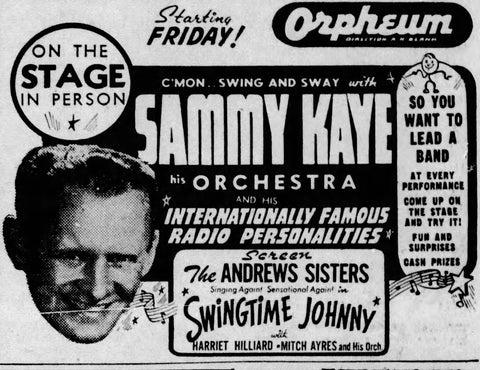 In 1944 the Sammy Kaye stage show named “Swing & Sway Revue” came to Orpheum Theater in Omaha, Nebraska. Sammy Kaye was a nationally known orchestra conductor. His revue featured a stage show with variety acts and a motion picture on the screen called “Swingtime Johnny.”