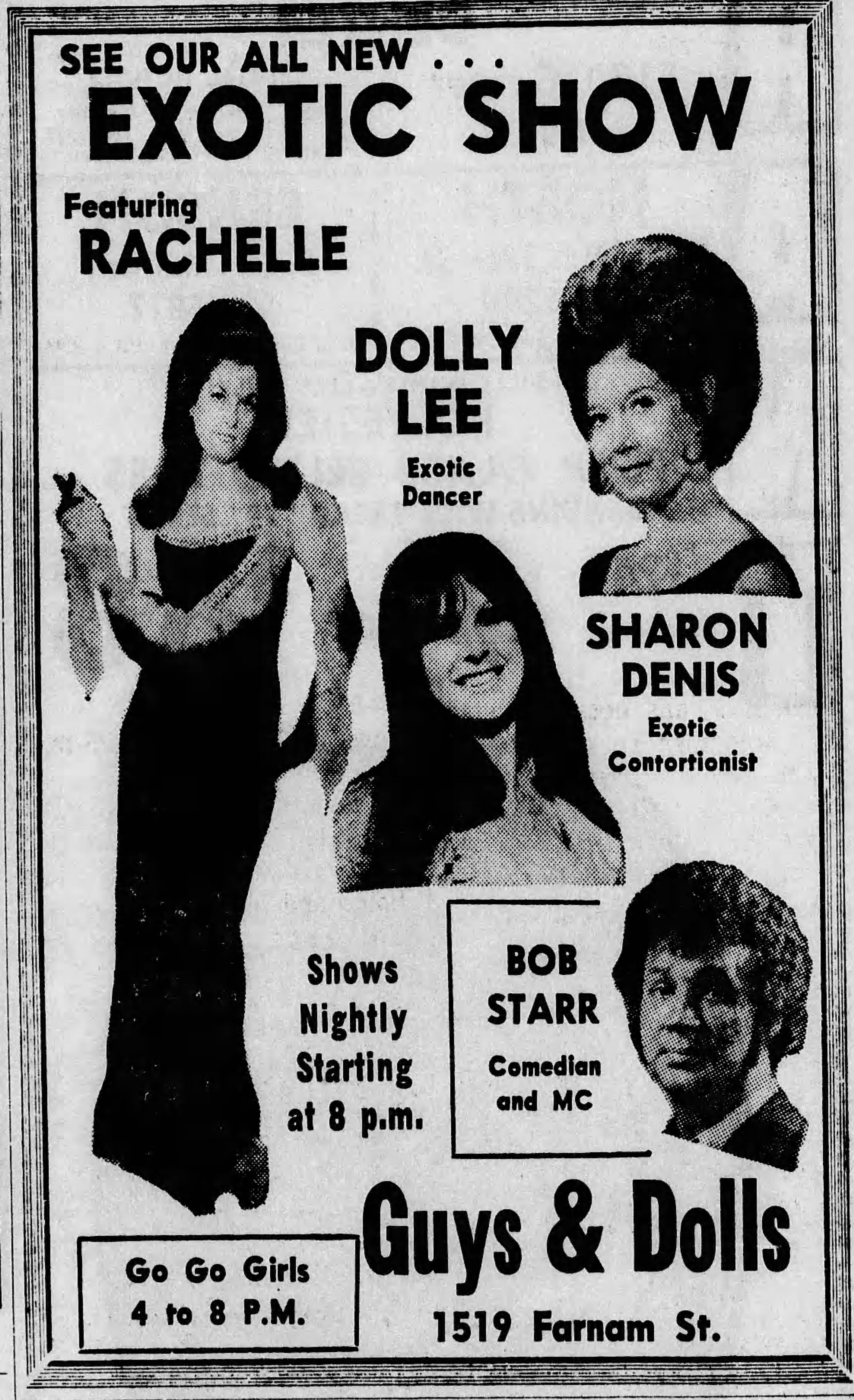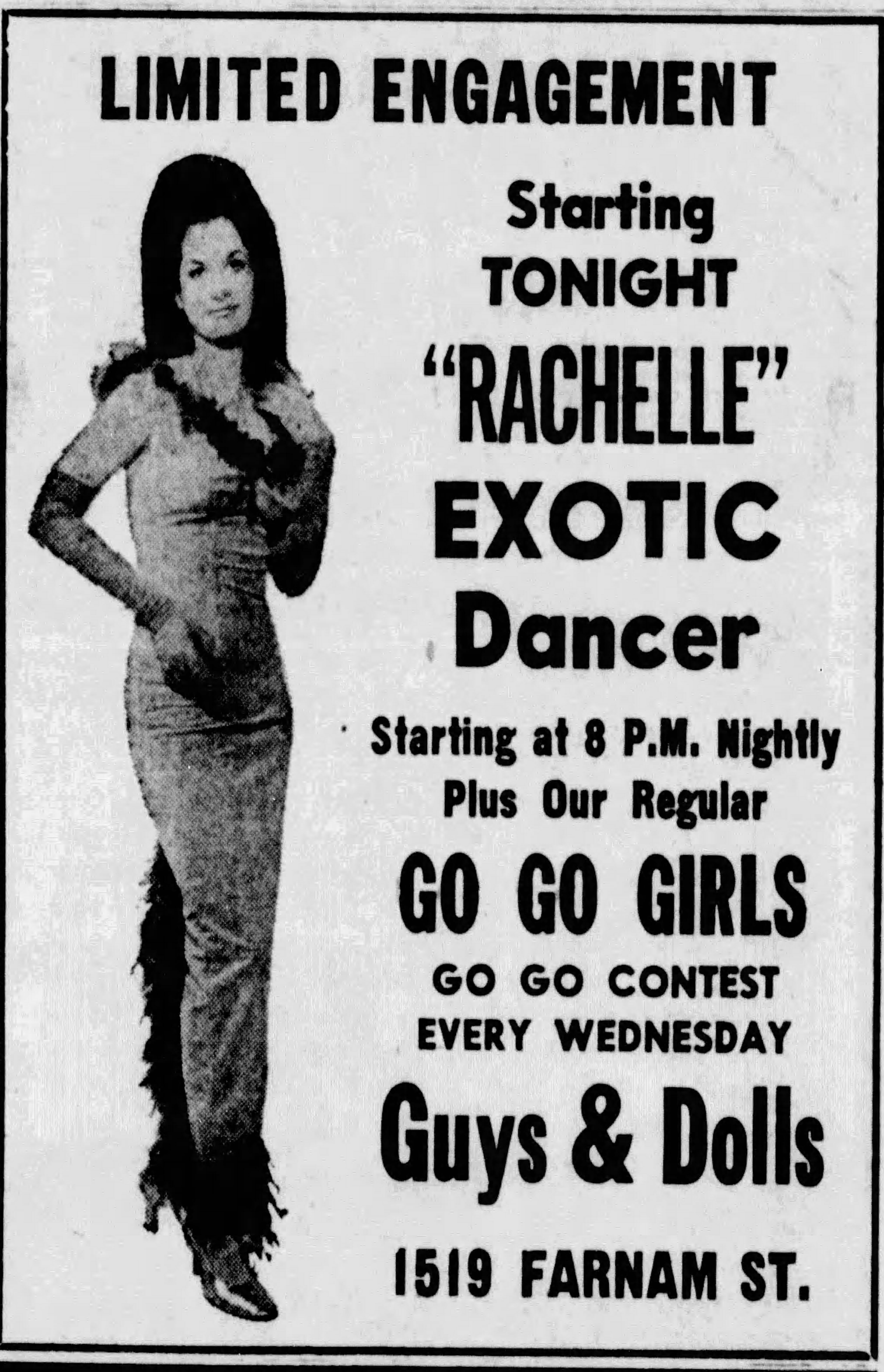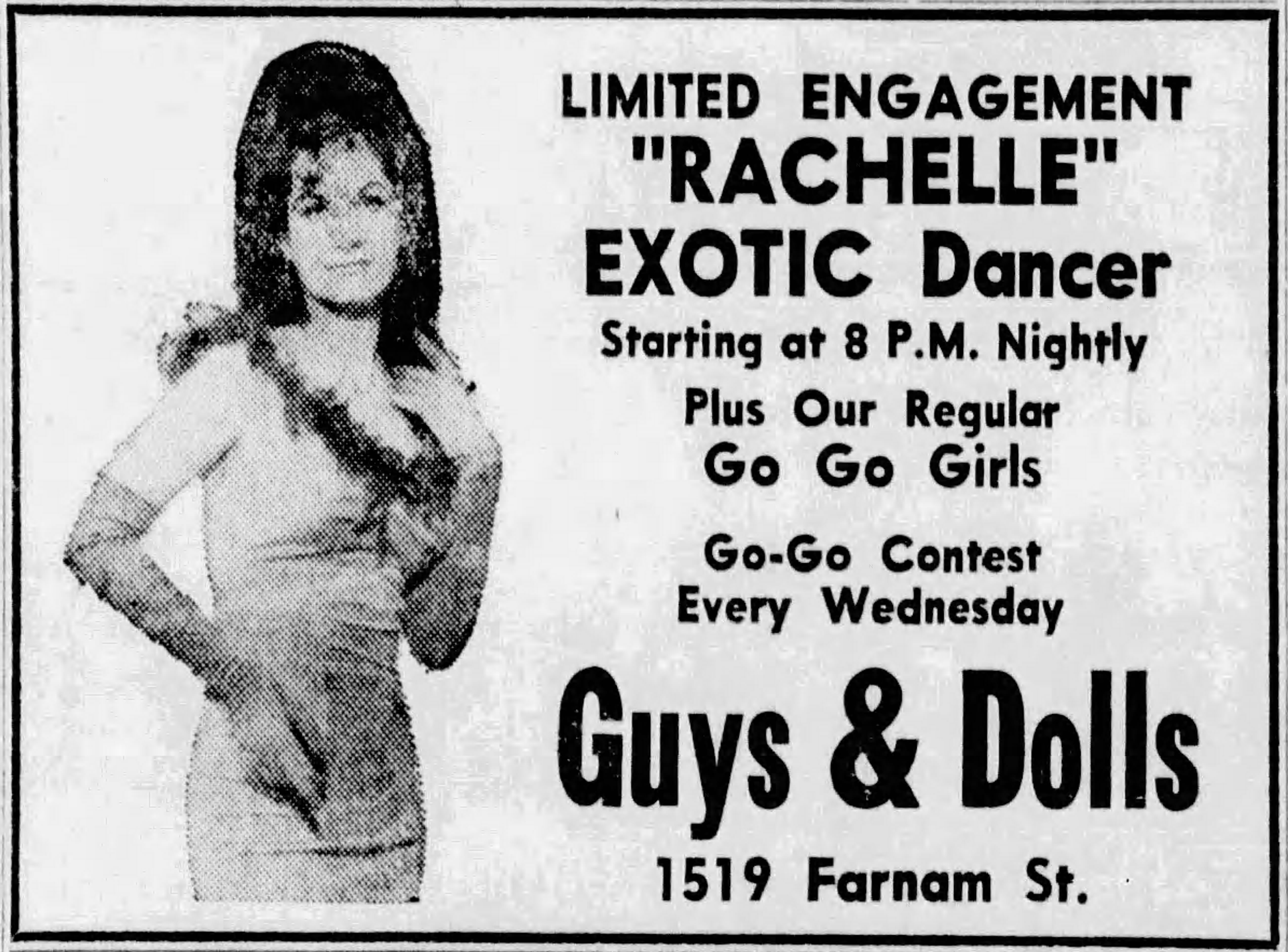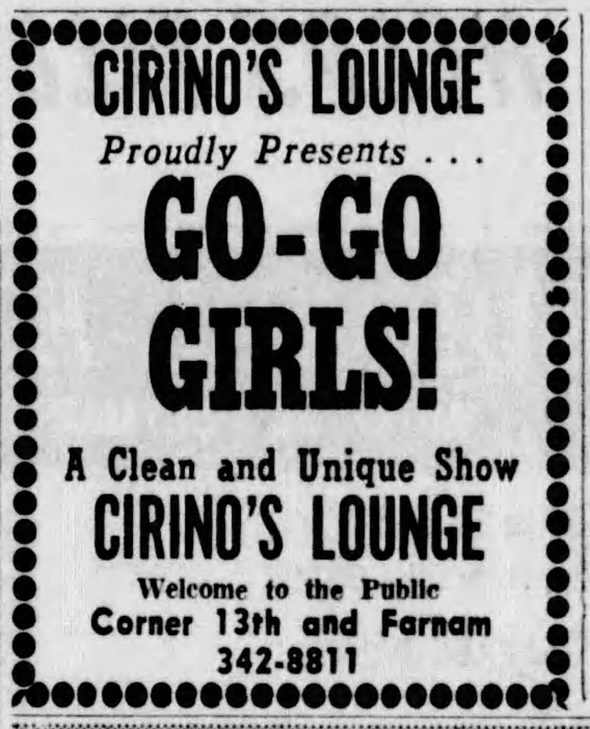 Cirino’s Lounge featured topless go-go dancers and in 1966 came under fire for exotics. Maree Lynn Custard, who boasted she was the ONLY topless a-go-go girl in Omaha, was convicted of indecent exposure in April 1933.