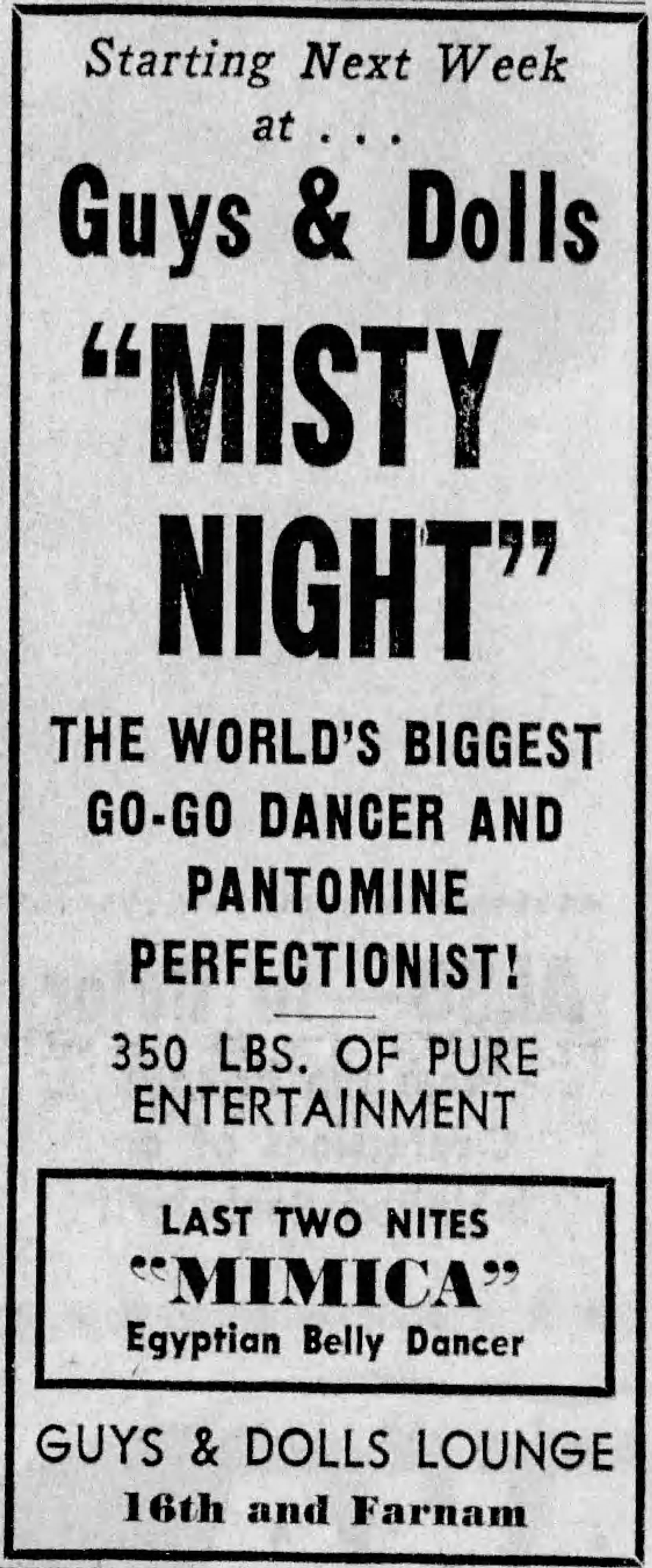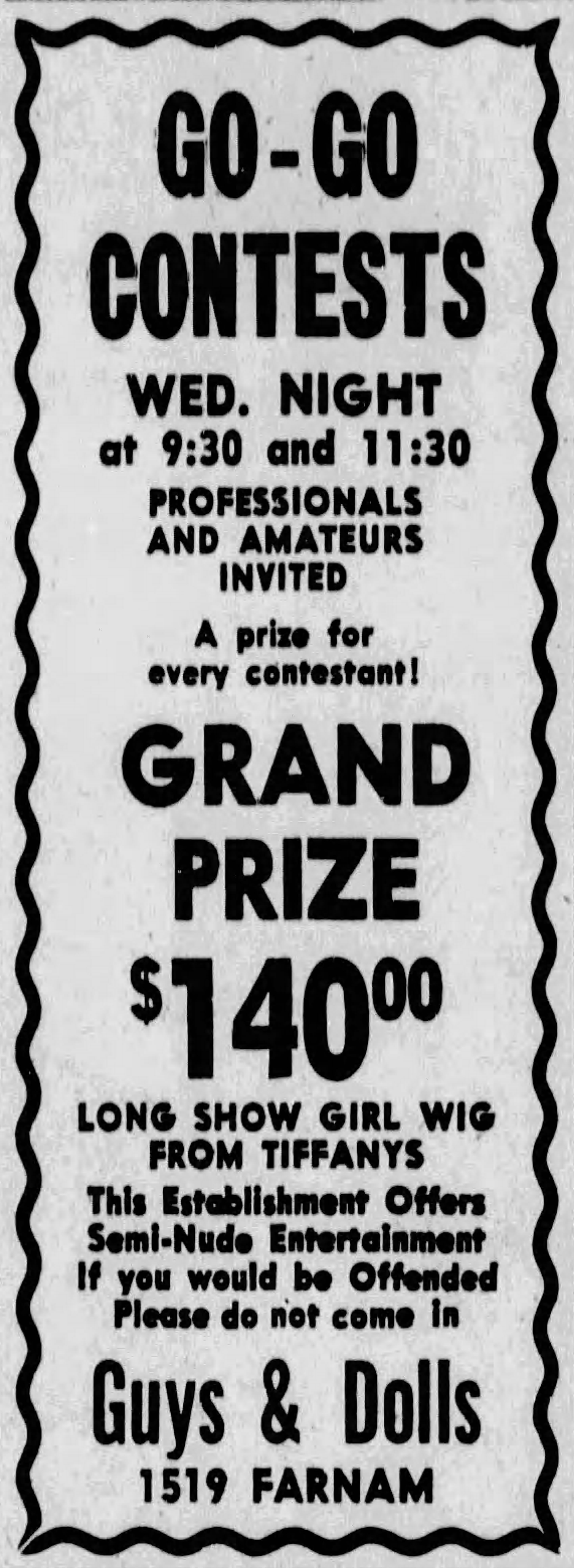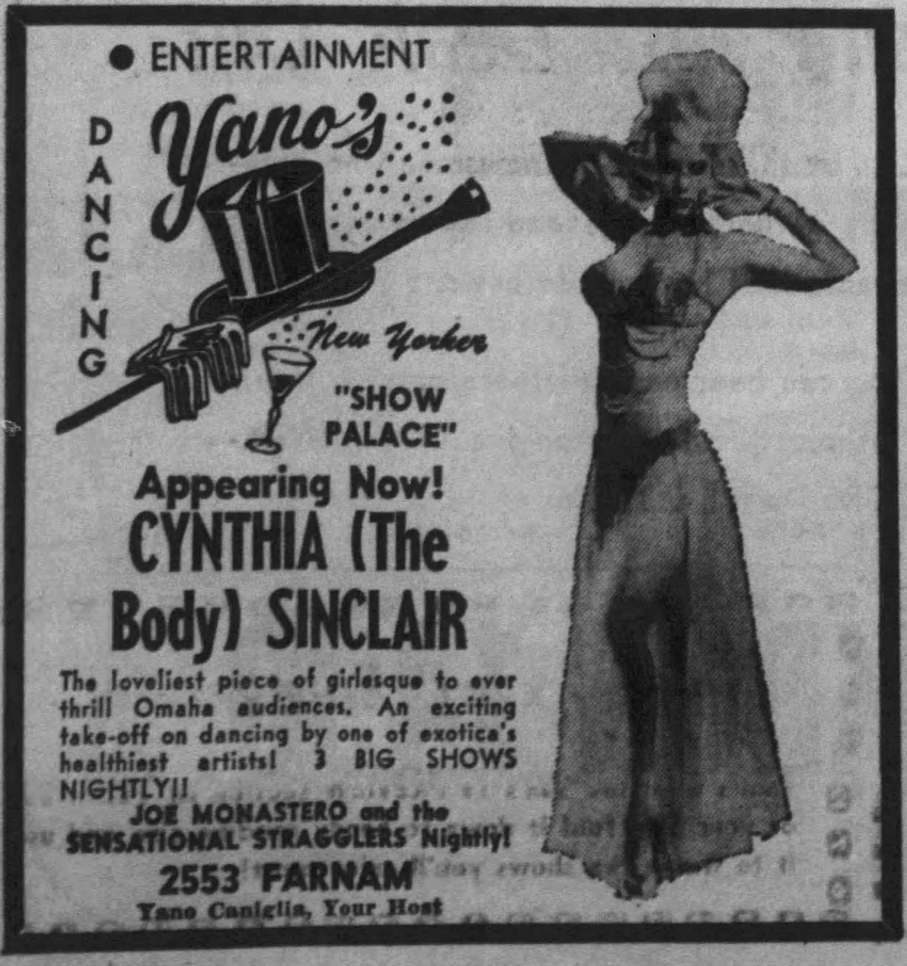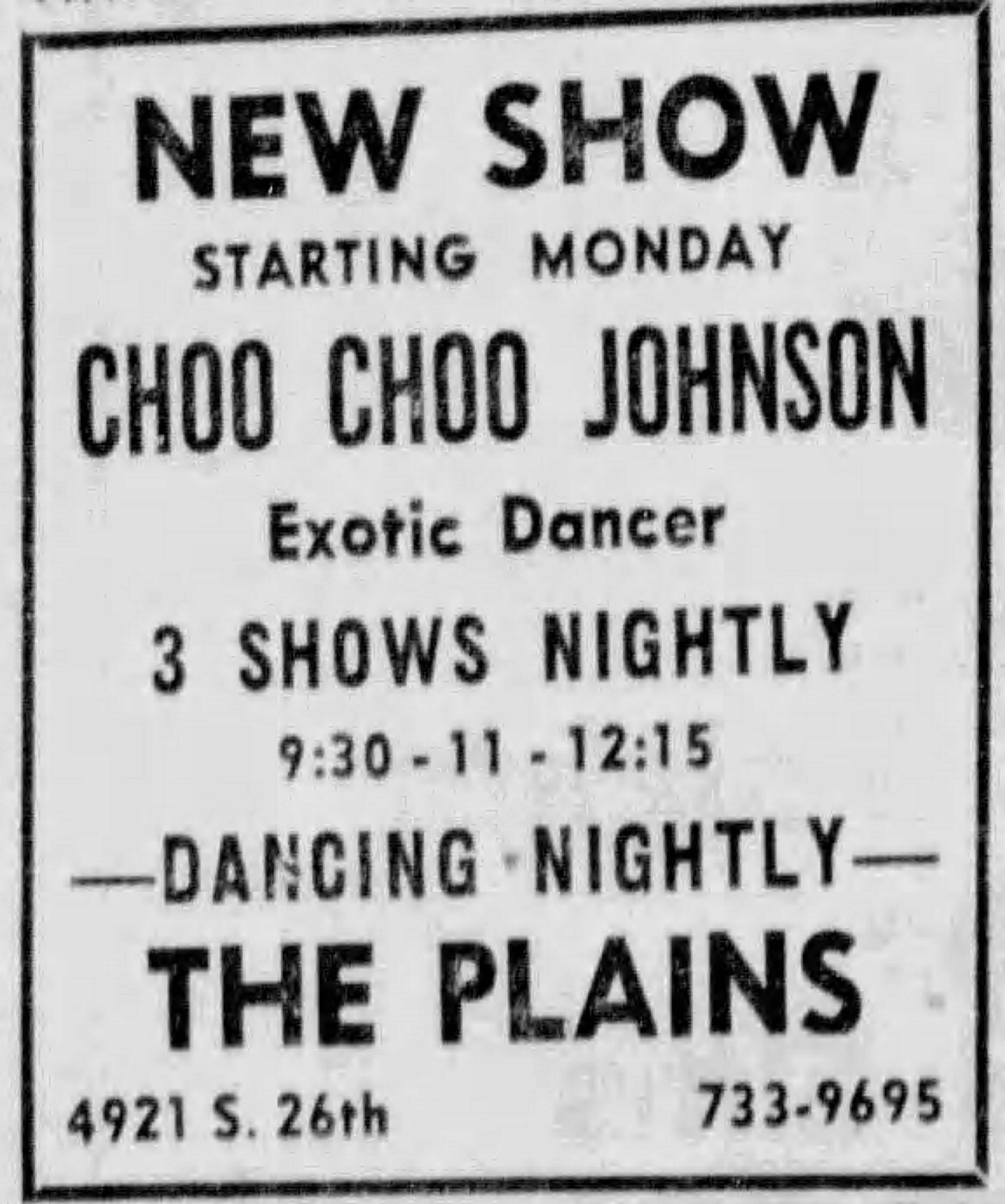 Cirino’s Lounge featured topless go-go dancers and in 1966 came under fire for exotics. Maree Lynn Custard, who boasted she was the ONLY topless a-go-go girl in Omaha, was convicted of indecent exposure in April 1933.