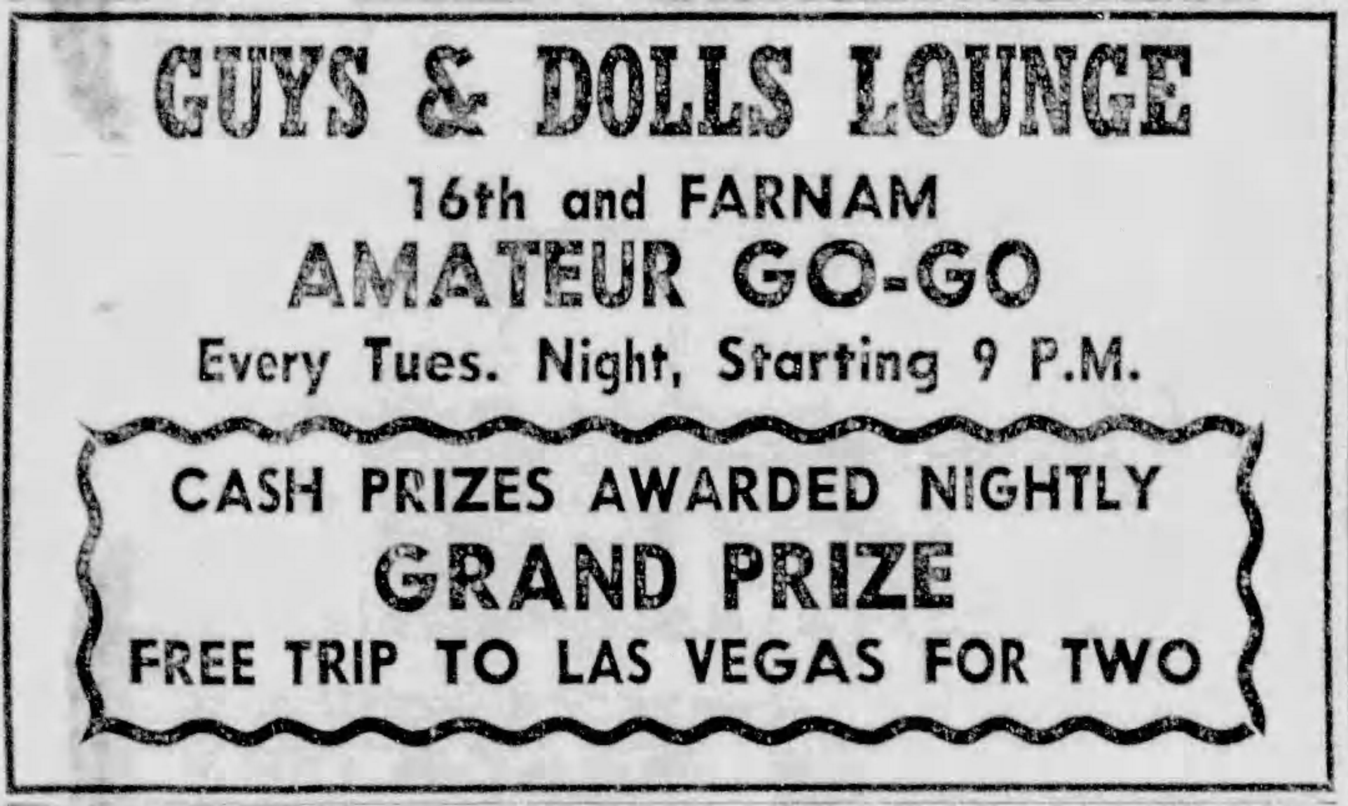 The Guys and Dolls Lounge featured burlesque dancers who performed topless and fully nude, and drag queens (called “female impersonators” back then). In