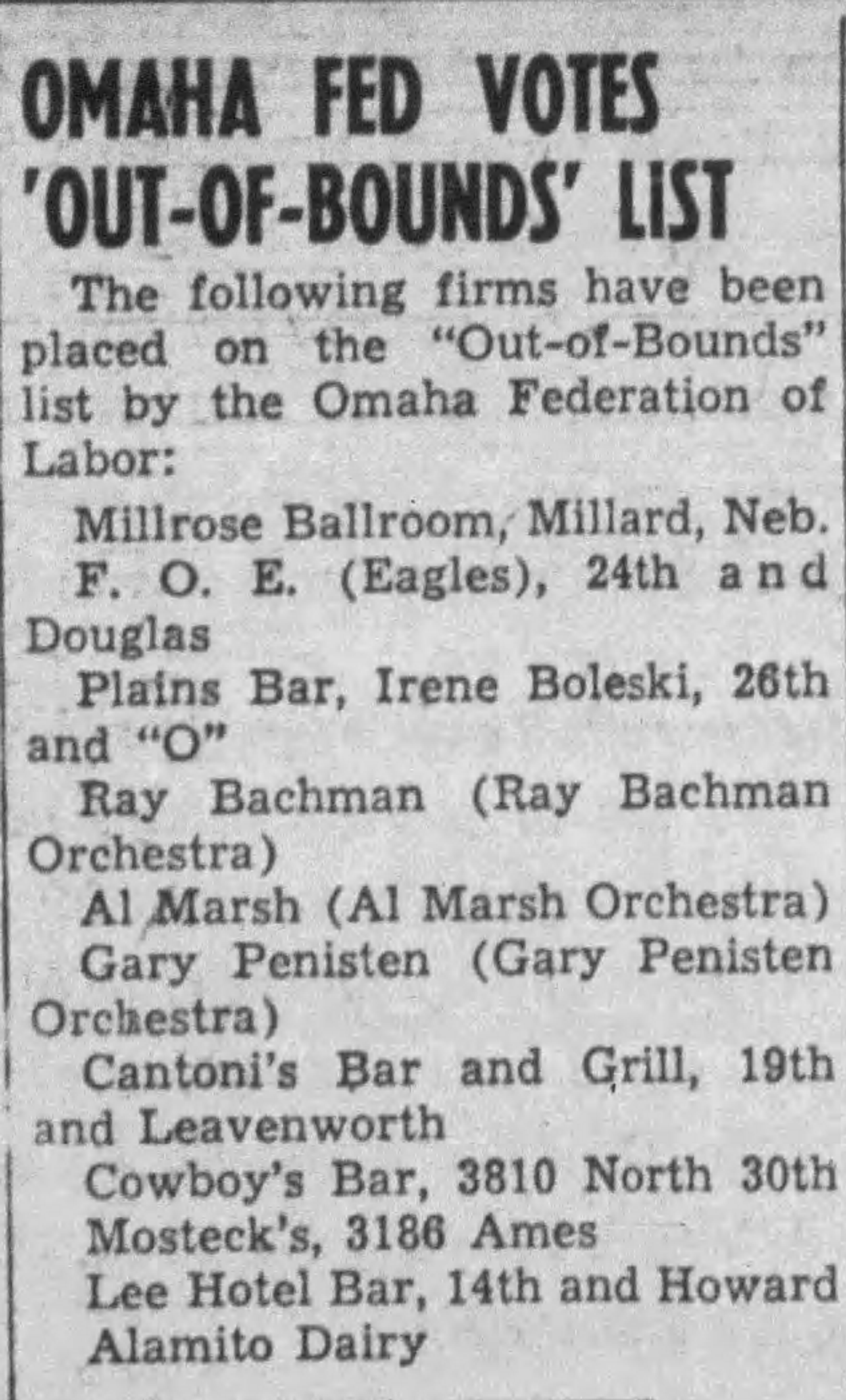 In August of 1953, a patron fell at the Angelo’s and sued the lounge for a broken leg. (Omaha Morning World Herald. August 27, 1953)