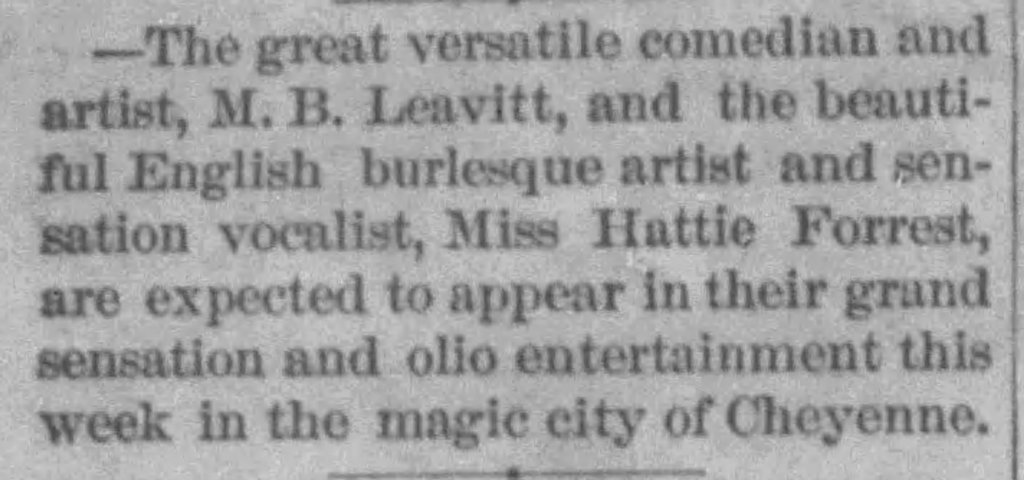 The comedian M.B. Leaavitt, along with an English burlesque dancer and singer, Hattie Forrest, performed in a variety show in July 1870. “They have a reputation of artists of a high order of merit…”
