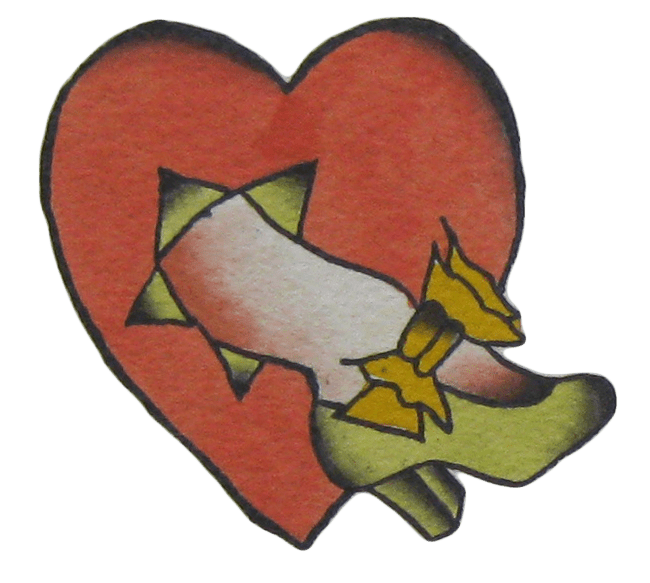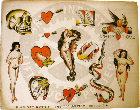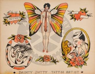 These pages of flash include motifs typical of mid-century American Traditional tattooing: a butterfly-winged woman, heartbreak banners, and stylized nude pin-ups.