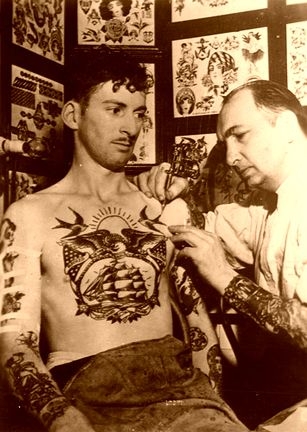 In the 1920s, tattoos were still largely associated with sailors, circus performers, and “exotic” spectacle. Anchors, swallows, and patriotic symbols were common among servicemen, while tattooed ladies appeared in sideshows as living canvases. Tattooing was also used cosmetically — women sometimes tattooed permanent makeup like lip liner or eyebrows, especially when cosmetics were expensive or inaccessible.