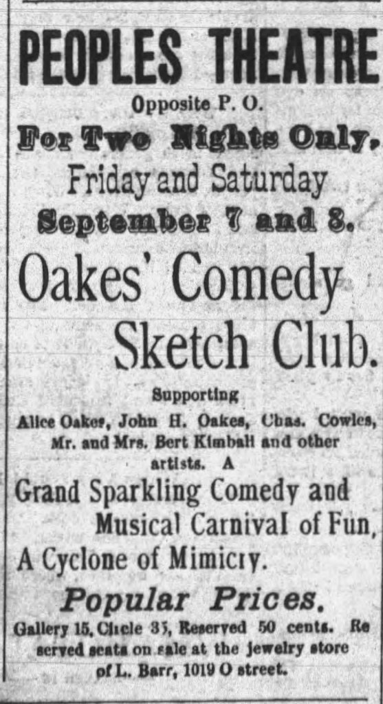 - Lincoln Journal Star. Ad for Oakes Comedy Sketch Club. Page 8. September 7, 1888