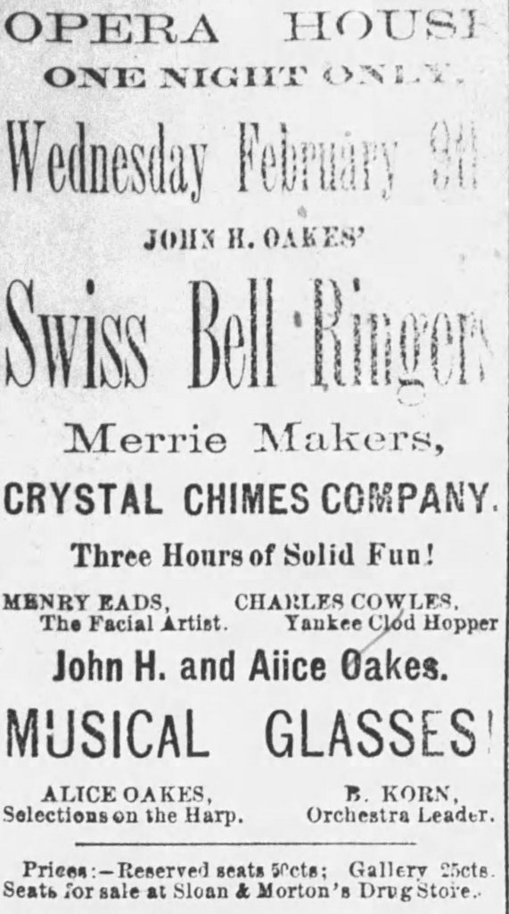 “For three hours the audience was royally entertained…A decided hit was made by John and Alice Oakes in their rendition of several selections from Mikado and others of the popular operas, on the bells…The wonderfully sweet tones brought out by them from glasses partly filled with water was duly appreciated.”