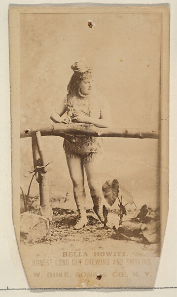 At the end of the nineteenth century, cigarette makers like W. Duke, Sons & Co. used burlesque performers to market their products. Bella Howitt, a burlesque actress, appeared in the company’s Actresses, Celebrities, and Children trade card series, which circulated widely as advertising ephemera. Her image illustrates how tobacco companies borrowed the glamour and notoriety of the stage to lend cigarettes cultural cachet, documenting the intersection of burlesque, consumerism, and visual culture in this period.