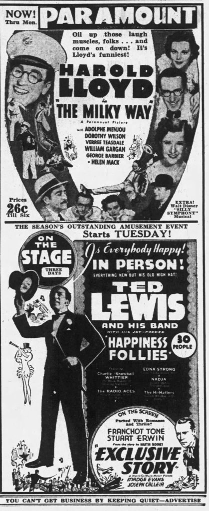 - The Gazette. Ad for Ted Lewis and his Happiness Follies at the Paramount Theater. Page 10. February 28, 1936