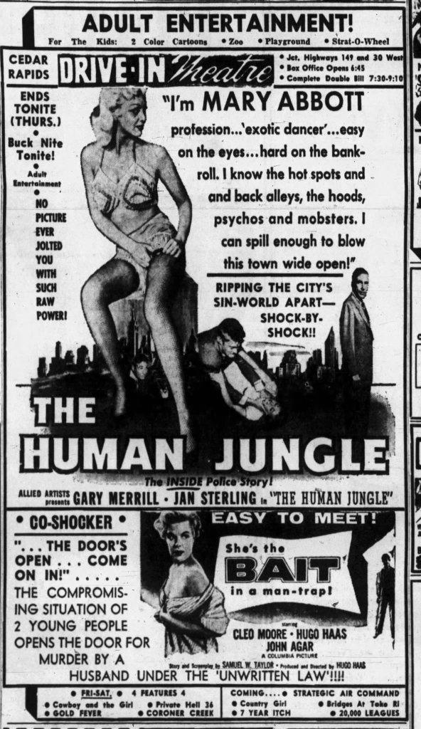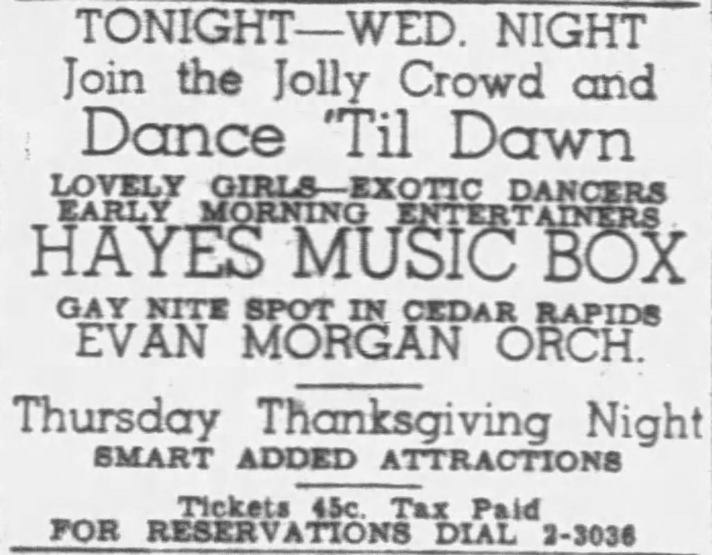 In October 1955, Cedar Rapids made headlines when a Chicago striptease performer was arrested during a Foresters of America Club stag party. The dancer pleaded guilty to charges of “immoral entertainment” after police discovered her performing in only a G-string and mesh hose before an audience of more than 150 men. She was fined $200 and given a three-month suspended jail sentence in Linn County.