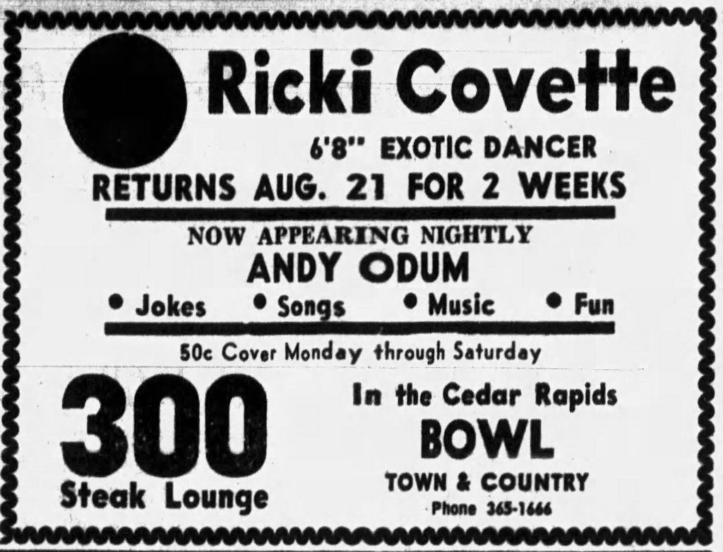 This advertisement from August 1967 promotes Ricki Covette, billed as a “6’8” exotic dancer,” appearing for a two-week engagement at the 300 Steak Lounge inside the Cedar Rapids Bowl. The ad emphasizes her extraordinary height as a unique draw, reflecting how mid-century striptease culture often marketed performers through sensational attributes—whether physical stature, themed personas, or novelty acts. Alongside Covette’s appearance, the venue also featured nightly performances by Andy Odum, offering jokes, songs, and music, positioning the lounge as a full-service entertainment spot blending comedy, live music, and adult-oriented dance.