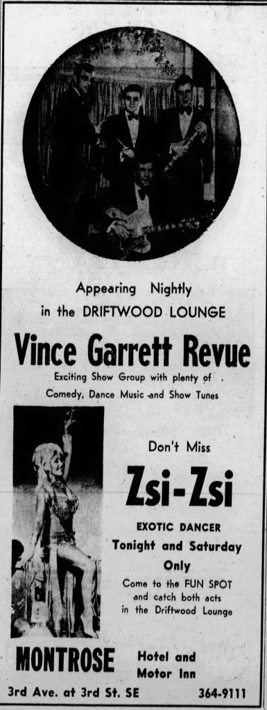 This advertisement from 1968 for the Driftwood Lounge at the Montrose Hotel in Cedar Rapids reflects the evolving striptease and nightclub culture of the 1960s. The ad promotes the Vince Garrett Revue, described as an “exciting show group” offering comedy, dance music, and show tunes—typical of mid-century lounge entertainment that blended variety acts with musical performance. Below, it highlights Zsi-Zsi, billed as an “exotic dancer,” appearing for a limited engagement. The language emphasizes exclusivity (“Tonight and Saturday Only”) and positions the venue as a “FUN SPOT,” signaling how striptease was marketed as sophisticated nightlife rather than fringe entertainment.