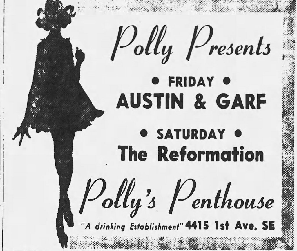Austin City Limits was located at 100 A Avenue NW and featured exotic dancers. In 1983 they advertised the show “Dirty Ernie” and his “male playboy exotic dancers”. It featured 4 shows a night with a $3 cover charge. Ernie was also booked at Doylar’s at 208 1/2 2nd Ave SE during the same period.