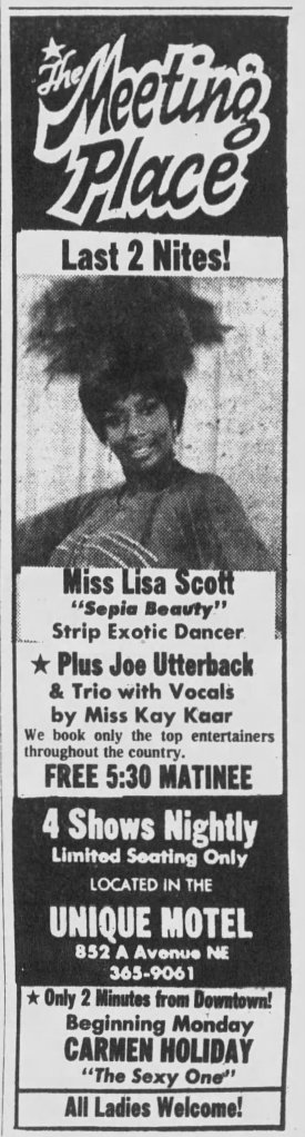 The Meeting Place was located inside the Unique Motel at 352 A Avenue NE. Their mottos were “Where Friends Meet” and “Home of the Headliners”. They featured 4 shows nightly and a new exotic dancer every week!