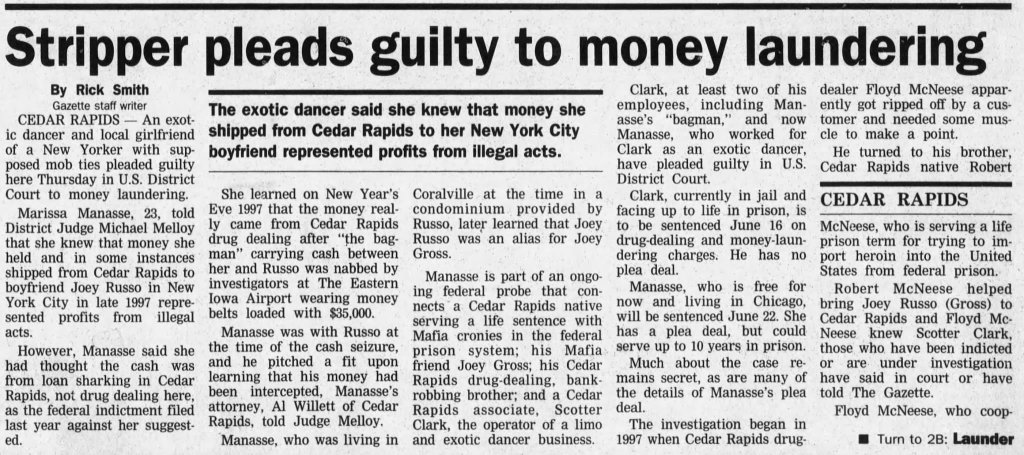 In March 2000, Cedar Rapids faced a sensational case linking exotic dancing to organized crime when a local performer pleaded guilty to money laundering in U.S. District Court. The dancer admitted that cash she transported from Cedar Rapids to New York City was tied to profits from illegal activities, including drug dealing and loan sharking. The investigation revealed connections to a broader criminal network involving aliases, luxury purchases, and interstate cash transfers. Federal prosecutors described the scheme as part of a Mafia-style operation, underscoring how adult entertainment businesses were sometimes entangled with illicit economies during this era. The case sparked public attention not only for its legal implications but also for what it revealed about the hidden intersections of nightlife, organized crime, and financial exploitation at the turn of the millennium.