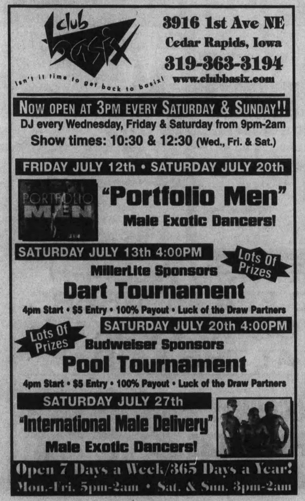 - The Gazette. Ad for Club Basix. Page 68. July 10, 2002